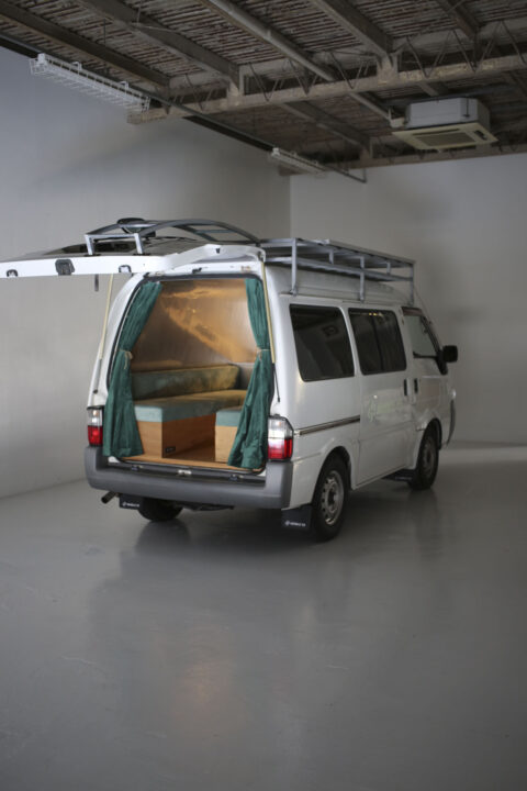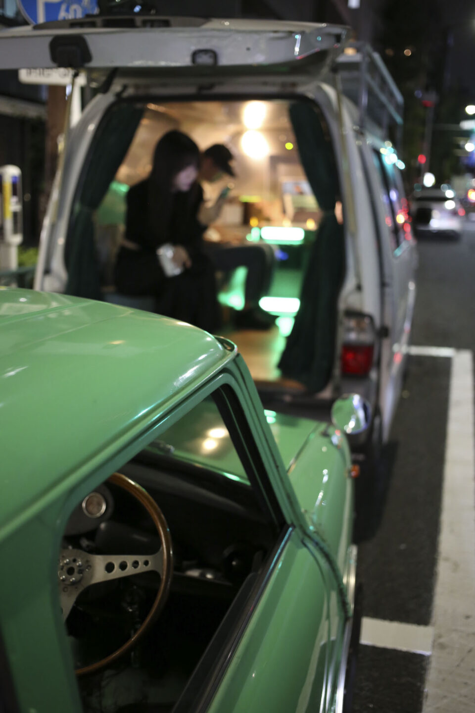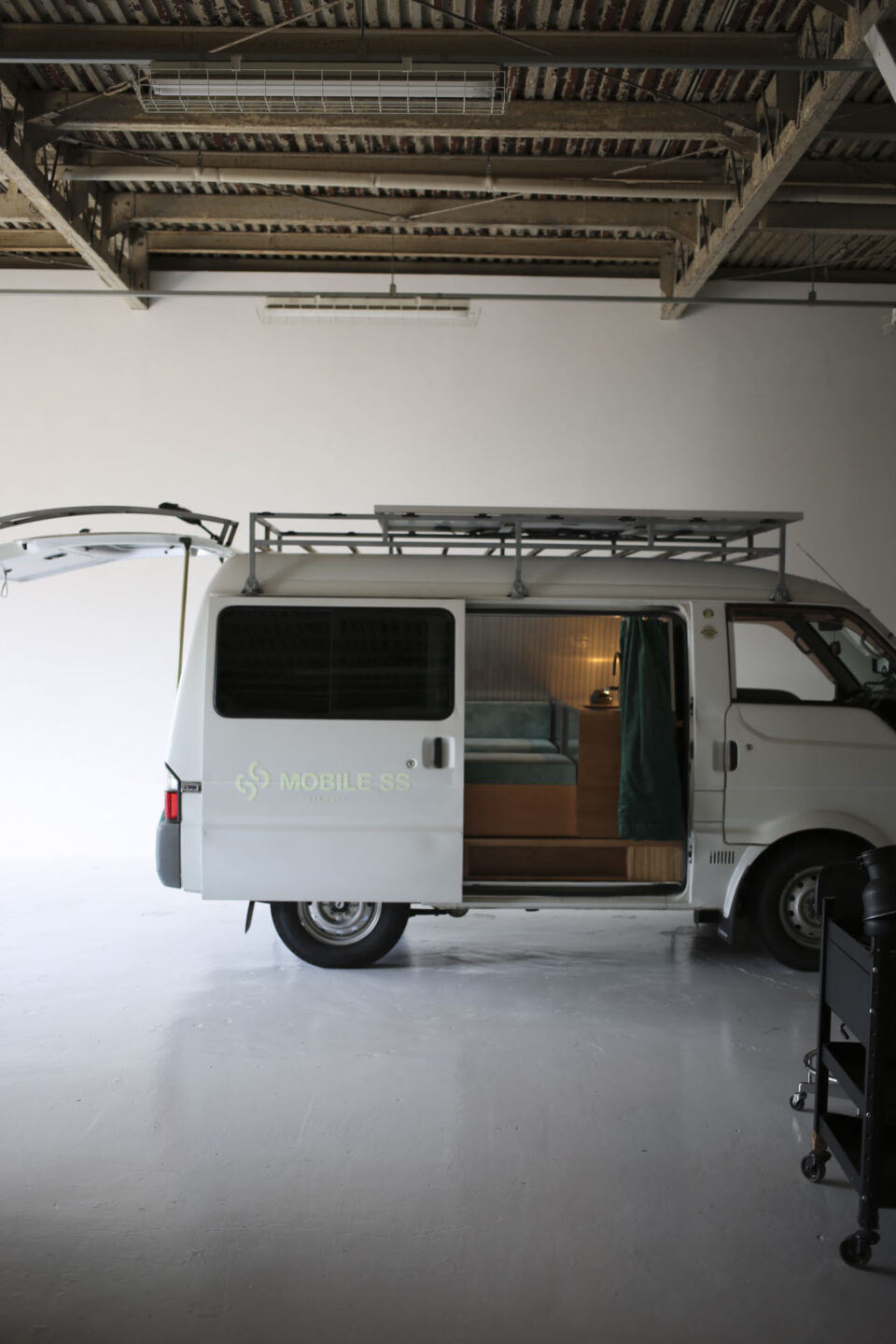 実際の活用例として、我々は「MSS – KIT」を、もともと、とあるオーナーさんがサーフトリップ用にカスタムしていた〈日産・バネット〉が奇跡的に《小松音響研究所》の真空管アンプを搭載していたことから、新たな「Mobile SS LISTENING BAR」として投入。従来のトレーラー型の〈Mobile SS〉に比べて、「MSS – KIT」を積んだ〈日産・バネット〉は小型かつ自走式なので、牽引が不要な分、機動力が高く、都市部から郊外、イベント現場までフットワーク軽く移動できるのがポイント。さらに外観は一見すると、どこにでもいそうな“業者のバン”。しかしハッチを開けた瞬間、そこには宇宙船のような異次元の空間が待っており、真空管アンプによる没入感あるサウンドを味わうことができる。このギャップこそが、この「MSS – KIT」の可能性を物語っているといえるだろう。「MSS – KIT」は、用途やシーンに応じて姿を変えながら、適材適所で力を発揮する万能キットともいえる。結果として、このバネットはサステナブルなエネルギーでリスニング体験も可能にするマルチバンへと進化したといえるだろう。これまでの取り組み事例は〈おあしす教授〉のInstagramをチェックしてみてほしい。